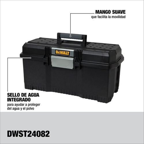 CARACTERISTICAS Y ESPECIFICACIONES - Caja de herramientas 24 pulg - Broche de Liberación a una mano - Sello hermético para proteger contra agua y polvo - Manija suave - Tapa con hendidura en V para tubos o madera - Alto: 28.7 cm - Largo: 60.4 cm - Ancho: 28.7 cm - Capacidad: 24.94 kg