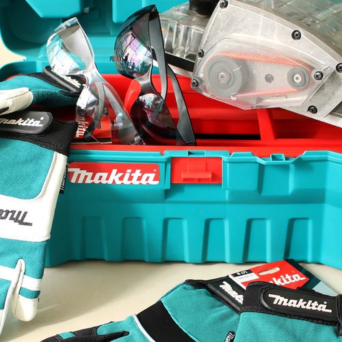 Caja de herramientas de plástico con detalle de la marca al frente y doble cerradura de metal.