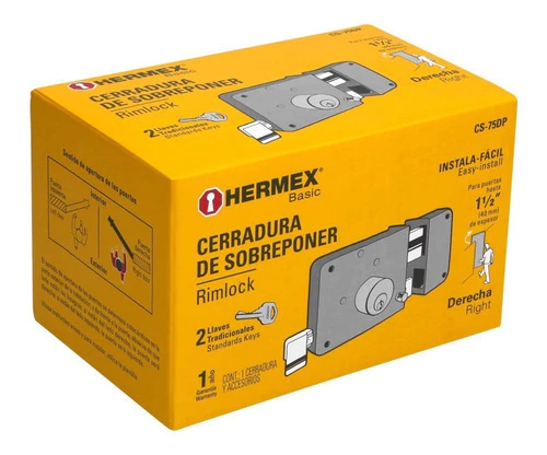 Cerradura sobreponer, instala-fácil, derecha, Hermex Basic -Cilindros de latón con 4 pernos -Con cilindro exterior integrado que facilita su instalación -Para instalación de puertas metálicas o de madera con espesor hasta de 1/2" (40 mm) -Botón de seguridad