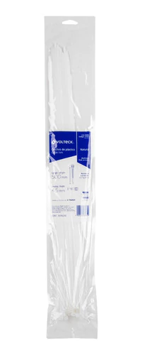 Especificaciones Resistencia a la tensión: 22.7 kg (50 lb) Largo: 50 cm Ancho: 4.5 mm Empaque individual: Bolsa con 25 piezas Inner: 10 Master: 60 Pallet: 2160