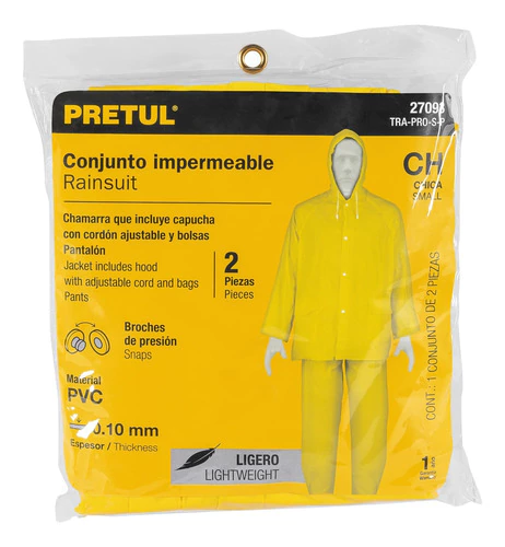 Conjunto impermeable ligero de PVC, talla CH, Pretul -100% PVC -El equipo de seguridad se debe inspeccionar antes de ser usado, para descartar defectos -de fábrica -Pantalón -Capucha con cordón de ajuste -Ventilación en axilas