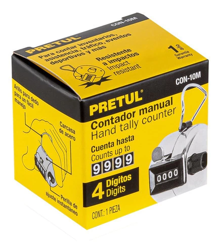 CONTADOR MANUAL 4 DIGITOS - Contador manual, 10 mil. - Carcaza de acero resistente a impactos. - Perilla y pantalla de ABS. - Arillo para dedo para un fácil manejo. - Ideal para contar inventarios, asistencia, tráfico, eventos deportivos y más. - Código: 24990.