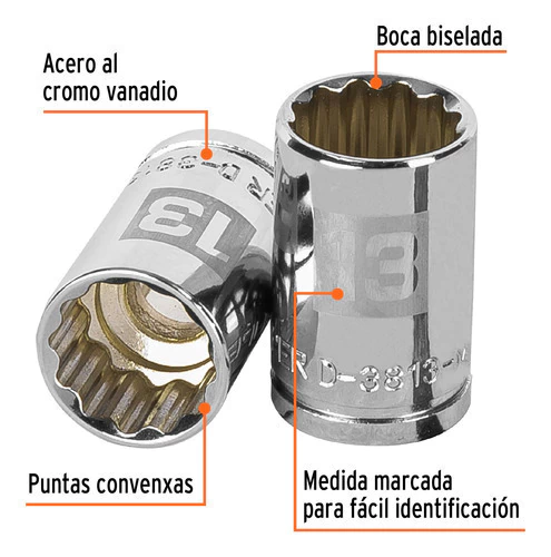 Especificaciones: Cuadro mando: 3/8'' (9.5mm) Dureza: 54HRc Empaque: Tarjeta plástica Largo: 28.5 mm Medida de boca: 13 mm Peso: 30 g Torsión máxima: 1450 lb/in