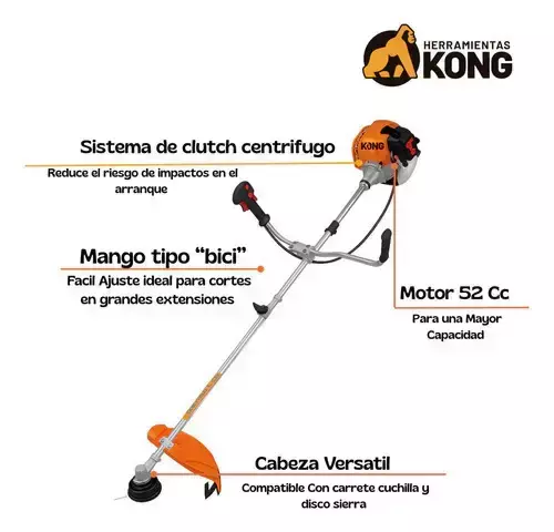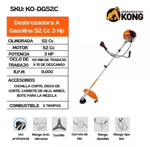 La Desbrozadora Kong DG52C es la herramienta perfecta para quienes buscan rendimiento y durabilidad en tareas de jardinería y mantenimiento de terrenos. Con una cilindrada de 52 cc y un potente motor de 2 tiempos refrigerado por aire, ofrece una potencia nominal de 3 hp, garantizando resultados excepcionales en cada uso. Diseñada para facilitar su manejo, cuenta con un diámetro de eje de 26 mm y una longitud de trabajo de 1.5 m, lo que permite acceder a las áreas más difíciles. Su capacidad de tanque de combustible de 1.2 L y su tanque de aceite de 260 mL aseguran una operación prolongada sin interrupciones. Además, su carburador de diafragma permite un rendimiento óptimo, con una relación de combustible y aceite de 1:25, ideal para mantener la máquina en condiciones óptimas durante su uso. Con la Kong DG52C, combata la maleza con eficacia y profesionalismo