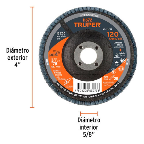 Disco Laminado T29 4'' Grano 120 Centro 5/8'' Truper 11672