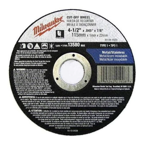 Características: Tipo de abrasivo: A60T Tipo: 1 Velocidad: 13,580 RPM Tamaño del eje: 7/8 in Aplicación: Corte de metal / acero inoxidable Tamaño: 4-1 / 2 '' Espesor 0.045 ''