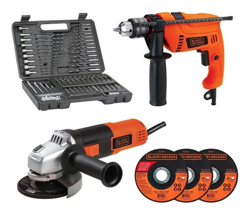 - Taladro De 1/2 IN - Empuñadura lateral - Barra de profundidad. - Llave de mandril. - 1 Esmeril Angular G720C3-B3 Black & Decker. - Empuñadura lateral. - Llave. - 3 Discos para cortes en metal. - Kit 109 Brocas Puntas P/destornillador