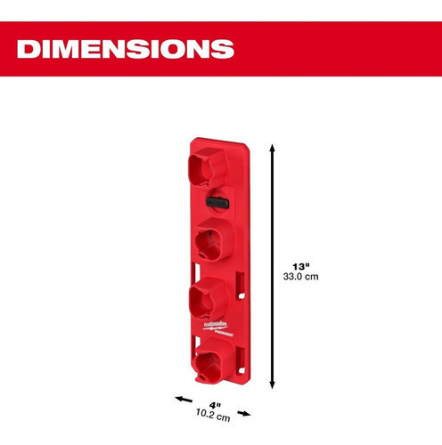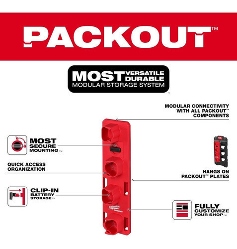 Nuestro bastidor de baterías PACKOUT M12 ofrece el montaje más seguro cuando se combina con las placas de pared PACKOUT, que sujetan firmemente la solución PACKOUT montada en la pared. Este estante de batería cuenta con almacenamiento de batería con clip para mantener las baterías en su lugar de forma segura y está optimizado para almacenar hasta cuatro baterías M12 de cualquier tamaño. Además, nuestro estante para baterías cuenta con conectividad con soluciones PACKOUT que le permiten personalizar completamente su taller. MILWAUKEE PACKOUT es el sistema de almacenamiento modular más versátil y duradero de la industria.