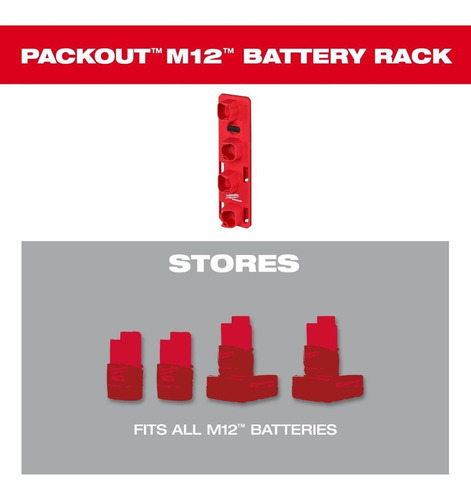 Estante para baterías M12 en placa Packout, marca Milwaukee, modelo 48-22-8338. Compatible con placas PACKOUT (48-22-8485, 48-22-8486, 48-22-8487) para colgarse.