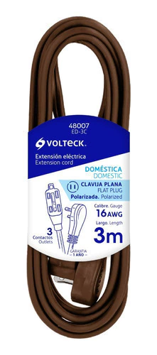 Especificaciones: Calibre: 16 AWG Color: Cafe Corriente: 8A Frecuencia: 60 Hz Hilos: 27 Longitud: 3 m Sección transversal: 1.31 mm² Temperatura máxima de uso: 30 °C Tensión: 125 V