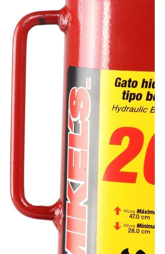 Gato Hidraulico Tipo Botella Mikels 20 Ton Modelo Gh-20 -¡ELEVACIÓN PERFECTA! El gato hidráulico nos permite levantar coches simplemente con líquido, lo único que necesitas son unos pocos mililitros de aceite, una palanca y un algo de trabajo manual; así cualquier persona puede levantar más de trescientas cincuenta veces lo que levantaría sin utilizar el gato hidráulico, cuyas propiedades de la hidráulica hacen posible levantar mucho peso ahorrando esfuerzo y con un optimo resultado, en el caso de los gatos hidráulicos de botella están diseñados en posición vertical y hace contacto directo entre la plataforma y el material que se va a levantar. - Sólo la prestigiosa marca Mikels entiende tus necesidades y trae para ti, el Gato Hidráulico de Botella 20 toneladas GH-20, el cual cuenta con empaques de nitrilo buna y nylon, pistón de acero SAE 1010, tubo cámara de acero SAE 1010, se recomienda utilizar aceite hidráulico, de uso horizontal. - Empaques de nitrilo buna y nylon - Pistón de acero SAE 1010 - Tubo camára de acero SAE 1010 - Se recomienda utilizar aceite hidráulico - El gato acostado no funciona si la bomba se encuentra hacia arriba
