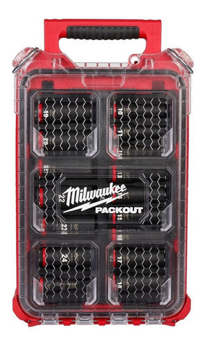 Juego de dados de 1/2'' milimétricos de 16 piezas Impact Duty, marca Milwaukee, modelo 49-66-6803. Incluye: caja Packout, dados de 10 mm, 11 mm, 12 mm, 13 mm, 14 mm, 15 mm, 16 mm, 17 mm, 18 mm, 19 mm, 20 mm, 21 mm, 22 mm, 23 mm, 24 mm, extensión de 3''.
