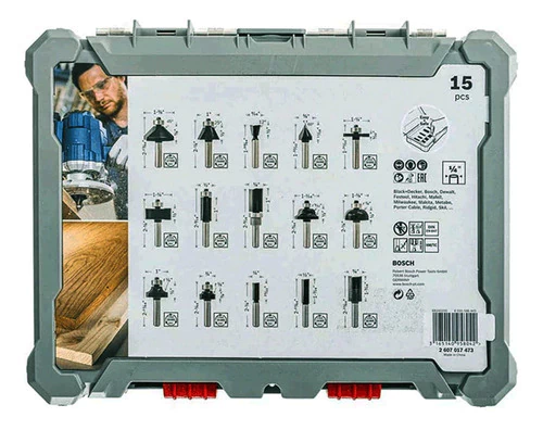 Contenido: Fresas de recorte al ras, Broca de patrón al ras, Broca de ensamble a cola, Punta de biselado, Punta de bicelado, Broca para ranuras en V, Cortador de ranuras, Broca para machihembrar, Broca Roman ogee, Broca para ranura curvada, Fresa para redondear, cortador de broca recta.