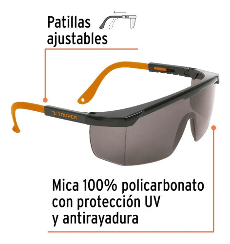 LENTES SEGURIDAD NEGROS AJUSTABLES Mica 100% de policarbonato con protección UV, antirayadura y anti-impactos Patillas ajustables Código: 14213