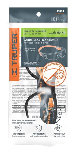 LENTES SEGURIDAD TRANSPARENTES BANDA ELASTICA Mica 100% de policarbonato con protección UV, antirayadura y antimpactos Banda elástica ajustable Puente nasal suave Código: 15304