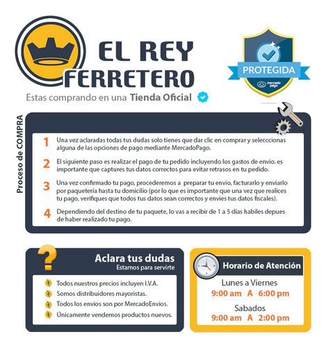 Todos los productos que vendemos cuentan con garantía la cual puede hacer válida directamente con nosotros*. Es necesario recordar que la garantía procede siempre y cuando el producto sea reclamado por un defecto de fábrica real y no por un mal manejo o abuso de la herramienta. *Ninguna de nuestras máquinas eléctricas, neumáticas, podadoras, desbrozadoras, motosierras, gatos hidráulicos, polipastos y soldadoras se aceptan en devolución. Estas deben ser llevadas a cualquier Centro de Servicio Autorizado. --------------------------------------------------------------------- Políticas de venta