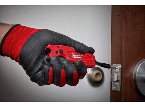 El cuchillo de utilidad plegable de Milwaukee® 6-IN-1 tiene una extensión de metal que evita la eliminación accidental de la cuchilla y un orificio de cordón para la conexión conveniente.