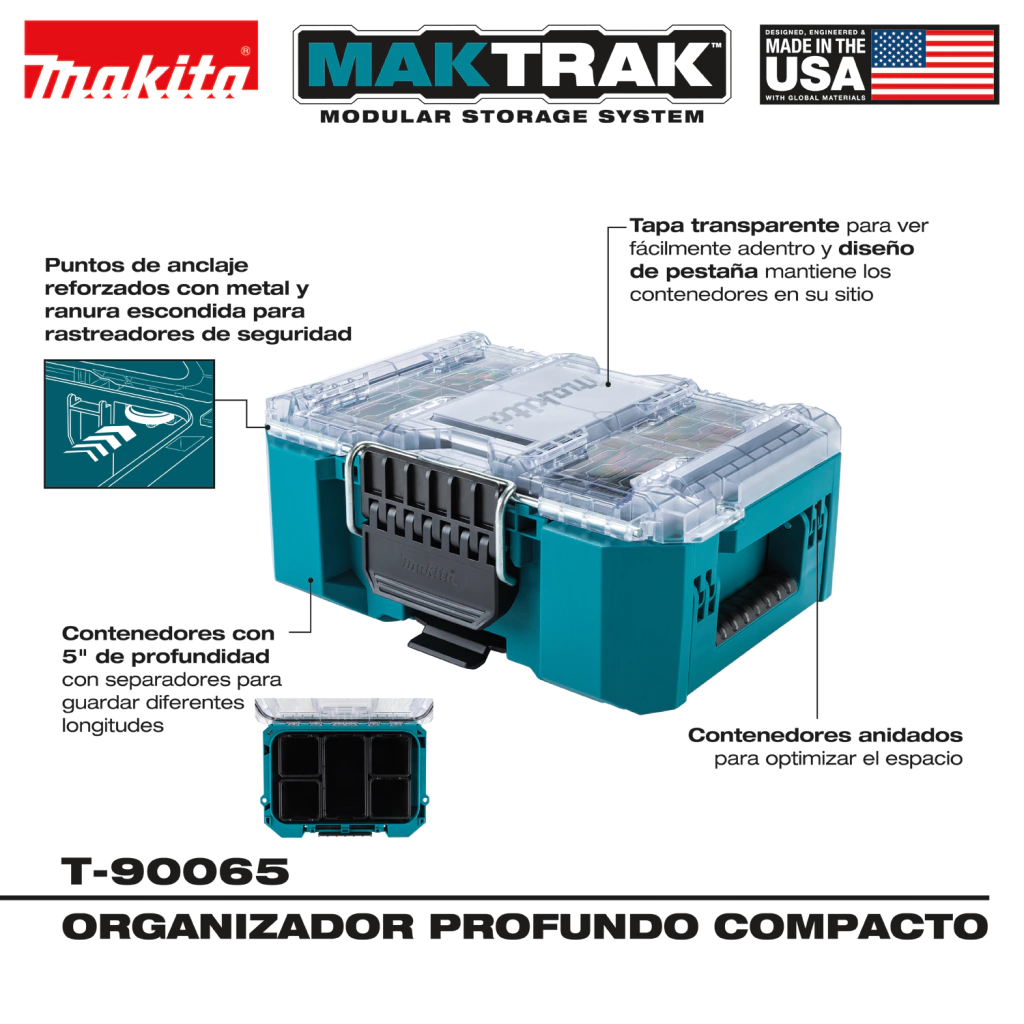 MAKTRAK™ de Makita es la Nueva Generación en almacenamiento modular. El Organizador Profundo Compacto MAKTRAK™ (T-90065) es una solución de almacenamiento modular para transporte, acceso, almacenamiento y organización de equipo y herramientas para el sitio de trabajo, y hasta 25% más capacidad de almacenamiento versus la competencia. Tiene la capacidad de 522 cu.in. con pestillos grandes compatibles con guantes para fácil acceso y una tapa transparente para ver dentro fácilmente.