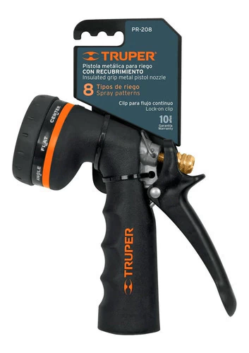 PISTOLA METALICA RECUBRIMIENTO 8 FUNCIONES Cuerpo metálico recubierto de doble inyección ABS/TPR Clip para flujo continuo, permite que el agua fluya sin apretar constantemente Cabeza giratoria para ajustar a la función elegida Código: 18477