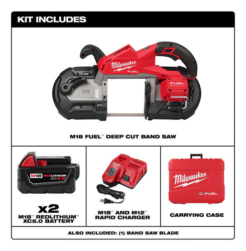 INCLUYE (1) M18 FUEL™ Deep Cut Band Saw(2929-20) (1) M18™ REDLITHIUM™ XC5.0 Extended Capacity Battery Pack(48-11-1850) (1) M18™ & M12™ Rapid Charger(48-59-1808) (1) Blade (1) Carrying Case