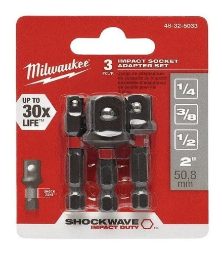 MILWAUKEE SHOCKWAVE - Los adaptadores para dados de impacto están diseñados para una durabilidad extrema y hasta 30 veces la vida útil. Los adaptadores de inserción de impacto SHOCKWAVE están hechos de acero patentado y tratados térmicamente para controlar la dureza. La ZONA DE DESCARGA optimizada absorbe el par máximo y evita la rotura, mientras que el acero CUSTOM ALLOY76 maximiza la resistencia al desgaste y los golpes.
