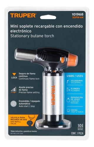 Mini Soplete recargable de gas butano, Truper -Carcasa de aluminio, cuerpo plástico y boquilla de acero inoxidable -Capacidad 64 ml -Ajuste preciso de flama -Botón de bloqueo para salida de gas -Válvula para recarga de gas