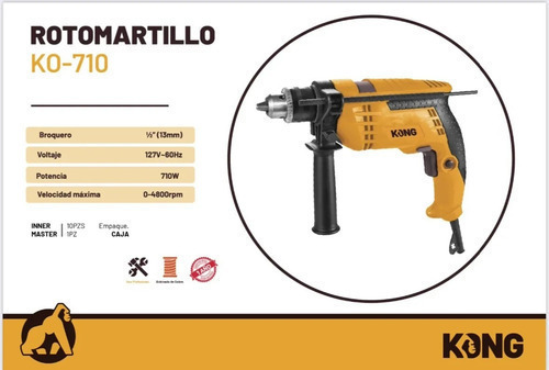 El Taladro Rotomartillo 1/2" reversible 710w Kong Ko-710 es la herramienta ideal para quienes buscan potencia y versatilidad en sus proyectos de bricolaje y construcción. Con una velocidad máxima de rotación de 4800 rpm, este rotomartillo permite realizar perforaciones rápidas y eficientes en diversos materiales, desde madera hasta concreto.