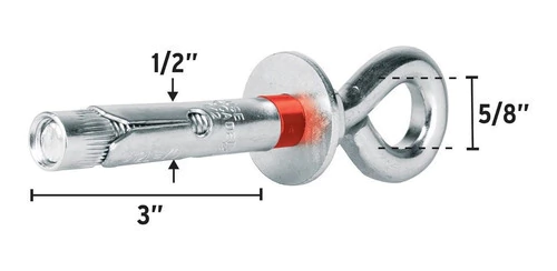 ESPECIFICACIONES Diámetro de broca: 1/2" (12 mm) Diámetro del ojo: 5/8" (15 mm) Largo: 3" (77 mm) Número de piezas: 2 Empaque individual: Bolsa con tarjeta