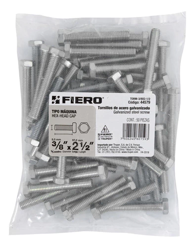 Especificaciones: Cuerdas por pulgada: 16 Diámetro de la cuerda: 3/8'' (9.52mm) Distancia entre cuerdas: 1.587 mm Empaque: Caja con 50 pzas Longitud : 2 1/2'' (63.5mm) Tipo de cuerda: 3/8-16 UNC